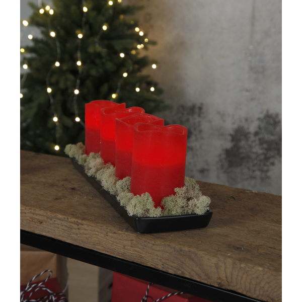 4-pack röda vaxljus. Dessa ljusen ger ifrån sig ett vackert sken som gör de lättplacerade. Ljusen är alla 12.5cm höga och vardera ljus drivs med 3 stycken AAA batterier. Den inbyggda timerfunktionen gör det lätt att ställa in när ljuset ska lysa.