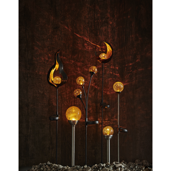 Solcellsdekoration på pinne, fint dekorerad med 3 amber glaskulor. Varje kula har 1 LED-ljuskälla som ger ett fint sken. Dekorera med pinnen i trädgården.